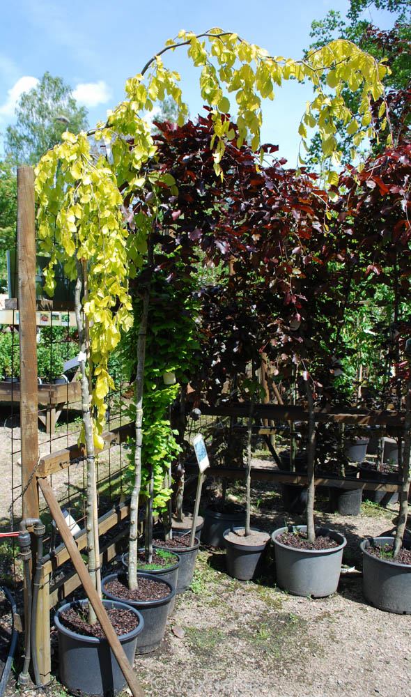 Långsamväxande med hängande växtsätt. Genomgående stam och något slingriga genar. Toppskottet bör bindas upp med bambukäpp till önskad höjd. Bladen är guldgula eller smörgula.
